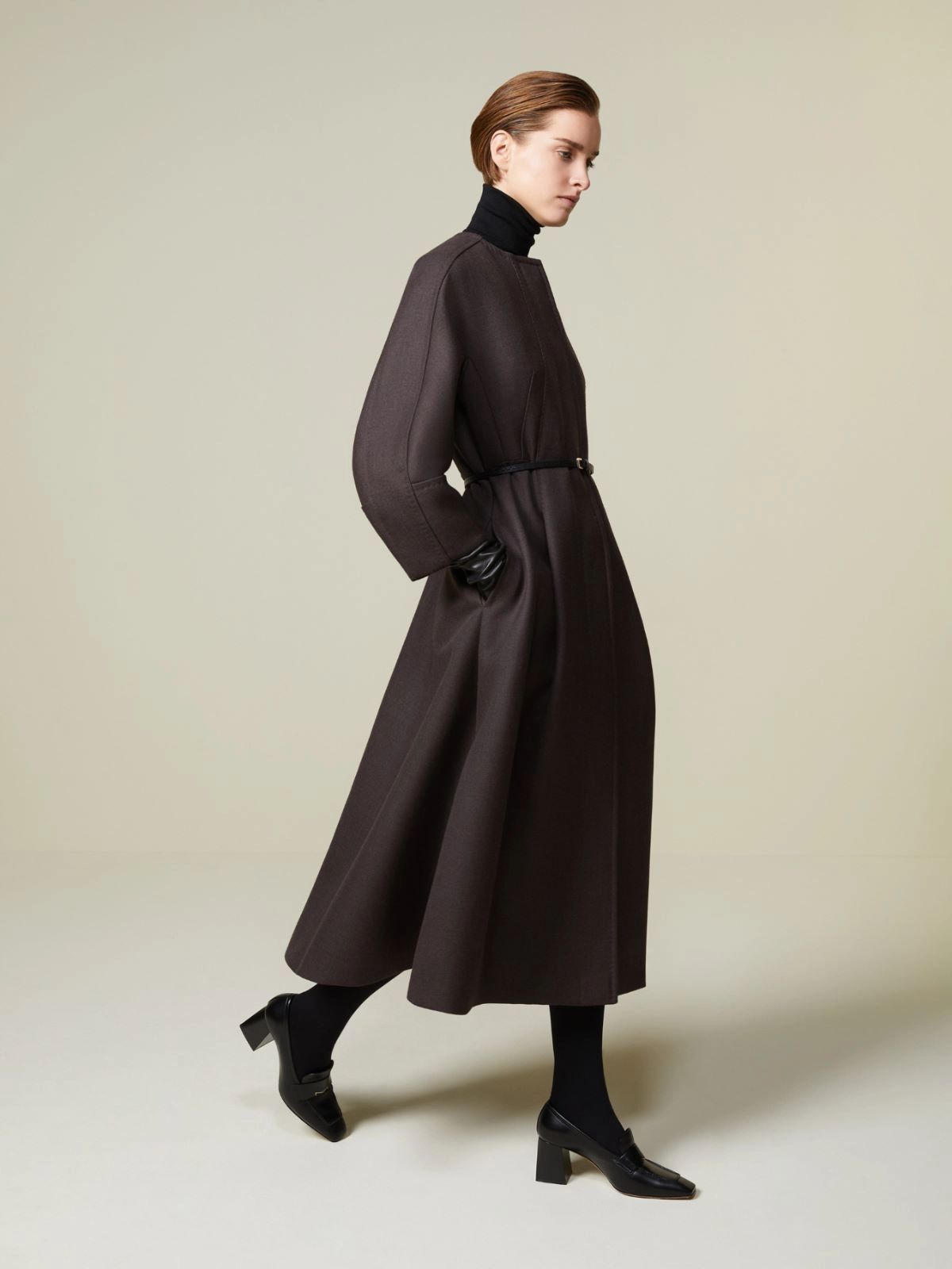 Podwójna tkanina z bardzo drobno czesanej wełny, która łączy płynność i doskonałą, rzeźbiarską formę.