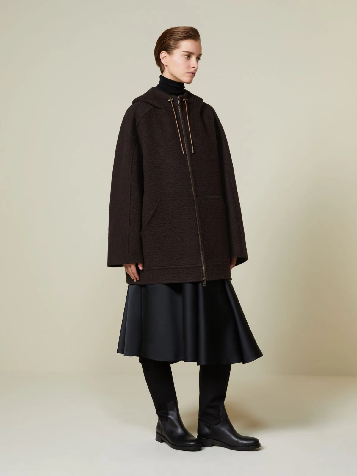 Oversize’owy fason cocoon z wygodnym zamkiem z przodu. Bardzo starannie wykonane rękawy.