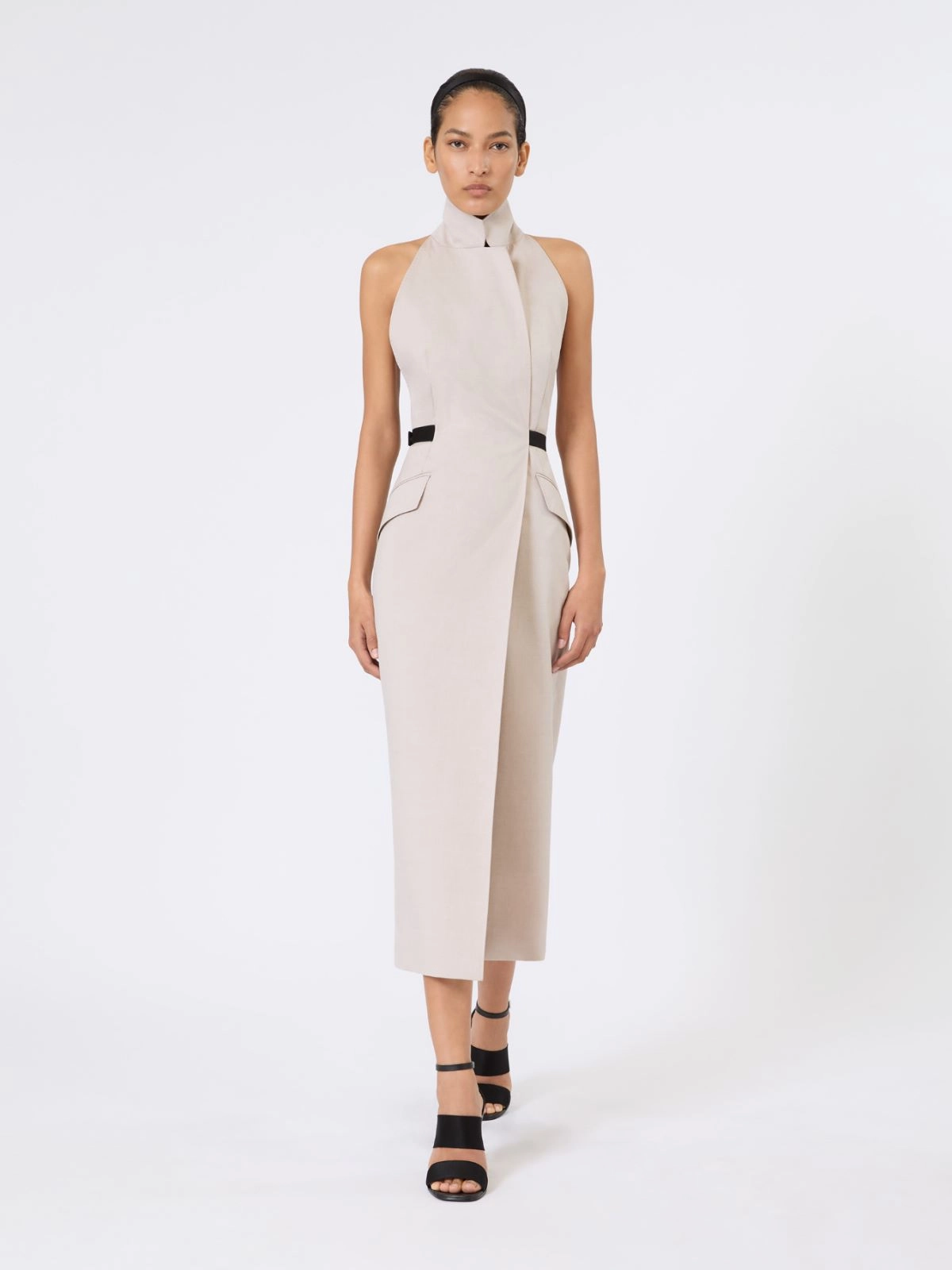 Długa sukienka bez rękawów w stylu płaszcza, charakteryzująca się odkrytymi plecami otoczonymi ramiączkami z taśmy elastycznej.