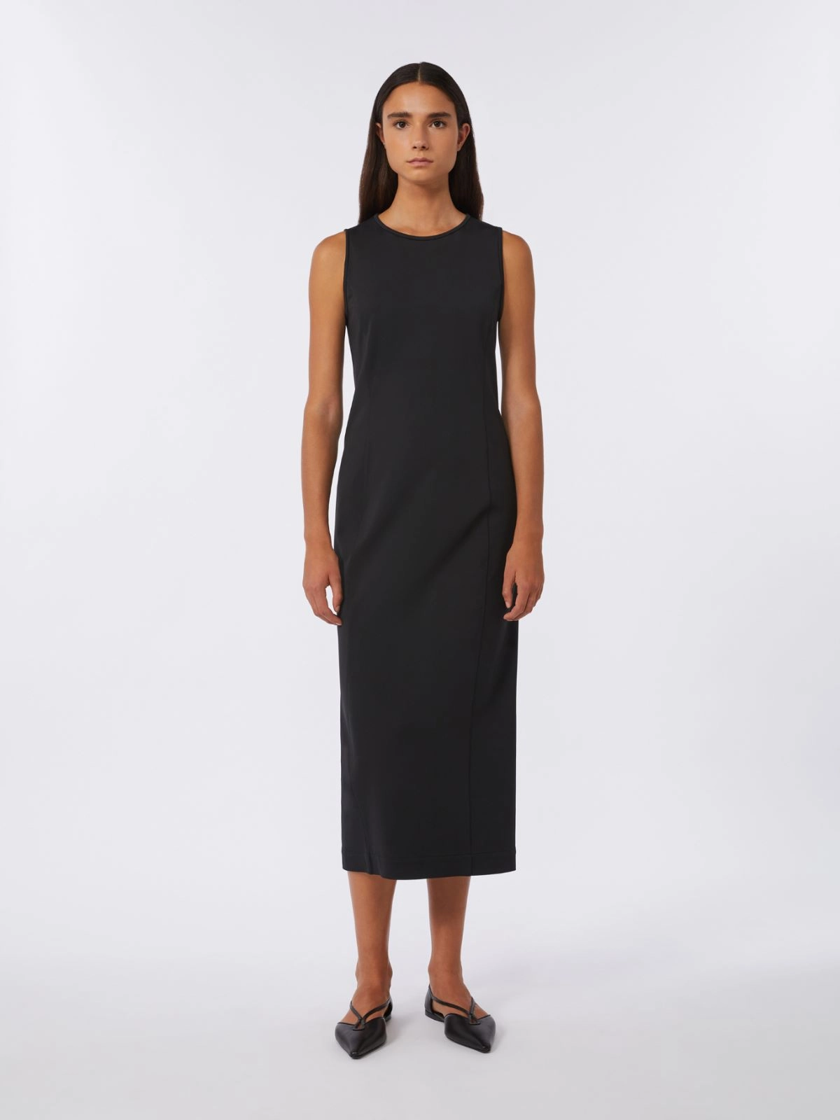 Sukienka midi bez rękawów, charakteryzująca się ołówkową sylwetką z motywem cięć podkreślających talię.