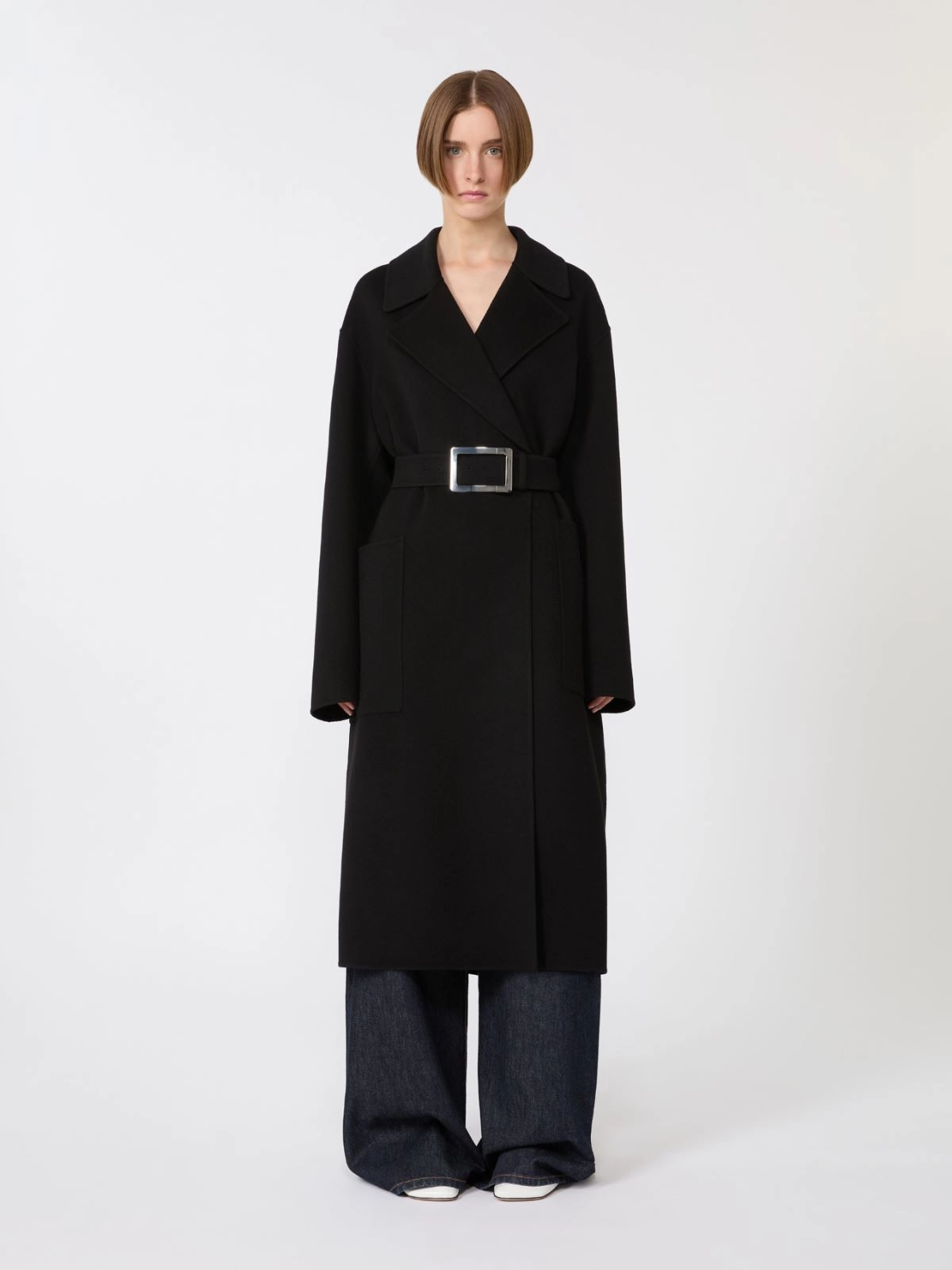 Długi dwuwarstwowy płaszcz o szlafrokowym kroju wykonany z miękkiej czystej wełny. Szerokie klapy i pasek w talii z metalową klamrą podkreślają kobiecy fason, dopełniony funkcjonalnym akcentem w formie dużych naszywanych kieszeni.
