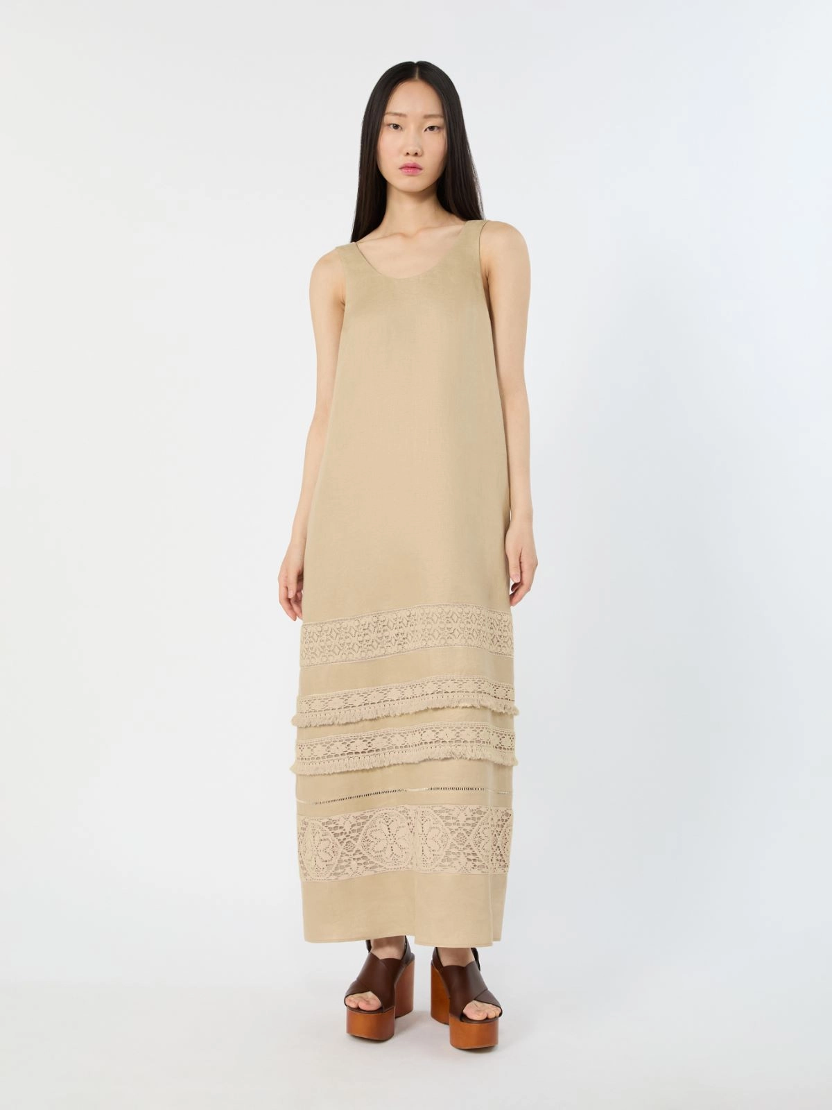 Długa sukienka bez rękawów o rozkloszowanym kroju z ozdobną tasiemką na dole. Artykuł jest częścią Kolekcji kapsułowej Mediterranean Ease.