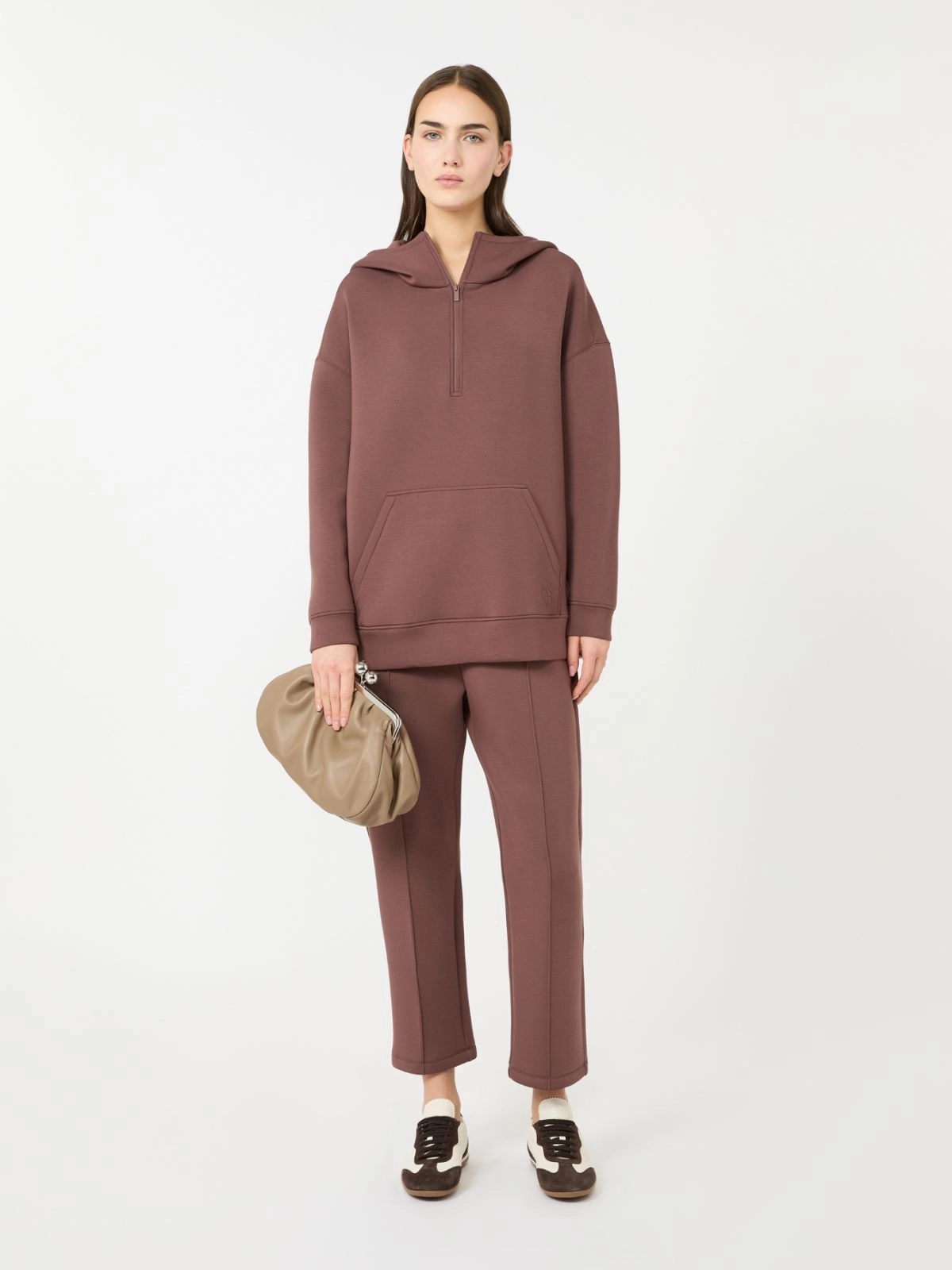 Długa bluza z kapturem i wyższym regulowanym dekoltem, zapinana na mały zamek z przodu.