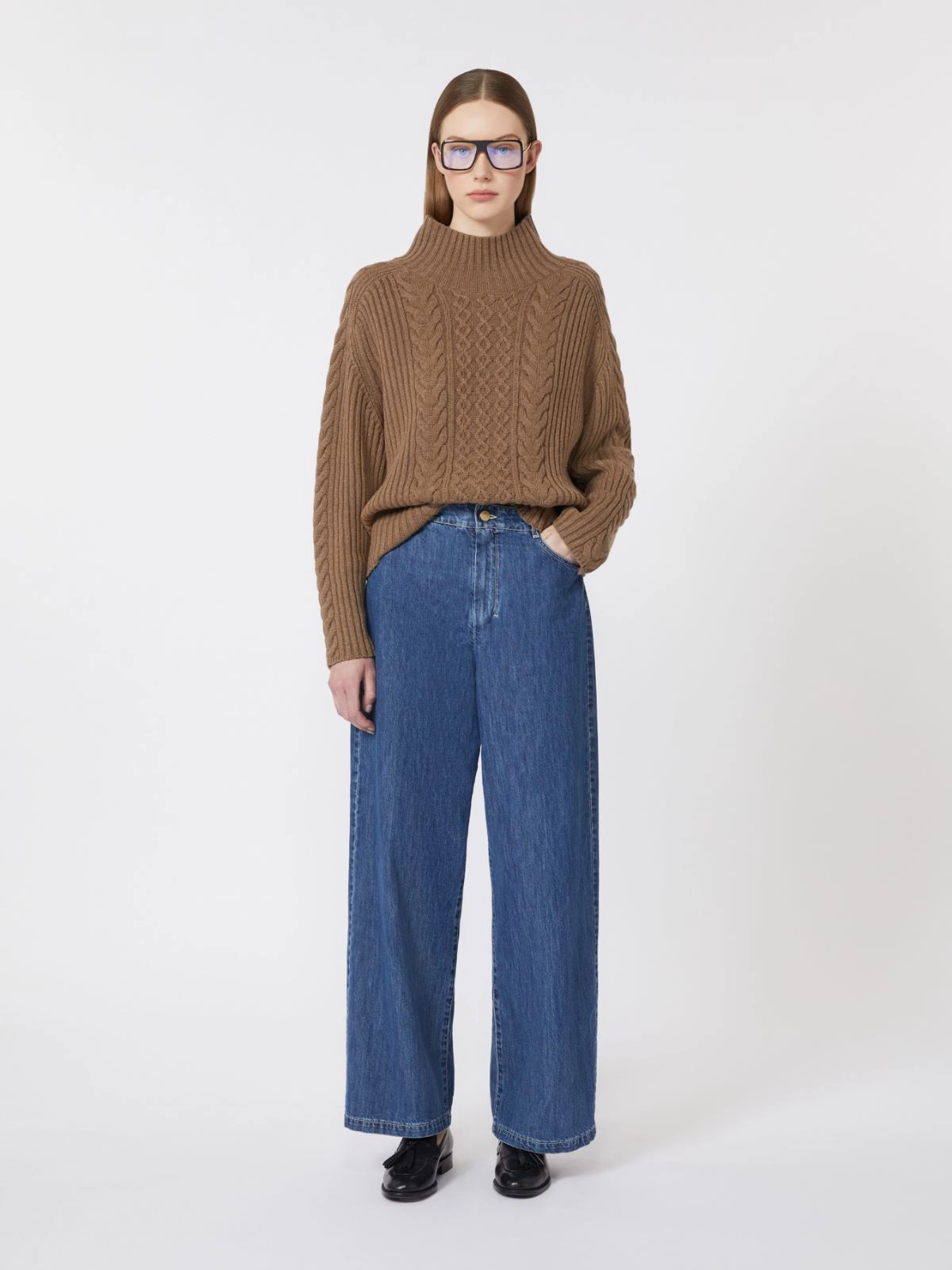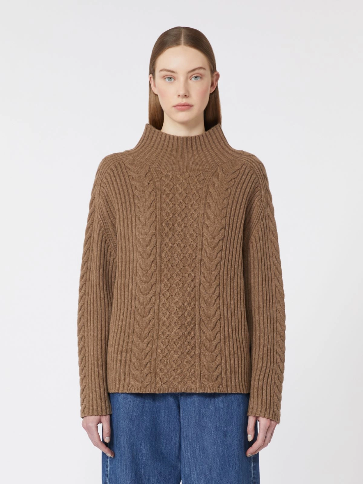 Sweter z golfem z mieszanką różnych ściegów i wykończeń: w prążki, warkocze i romby.